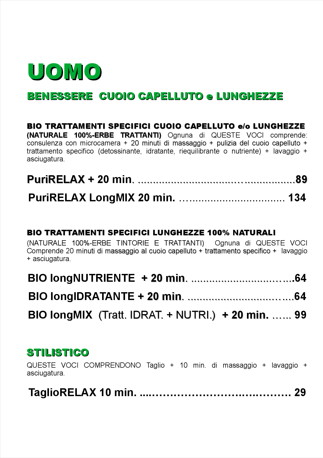 È un Taglio su misura per te oltre alle regole di proporzioni e di forma del viso che possono aiutare, la cosa più importante è adattare il taglio alle tue esigenze più che alla moda stessa, un taglio che rispecchi la tua personalità inoltre vivrai un momento di relax in modo da scaricare tutte le tensioni cosa molto importante per il quieto vivere grazie a 10 min. di massaggio alla testa che farai durante il lavaggio + semplice asciugatura.